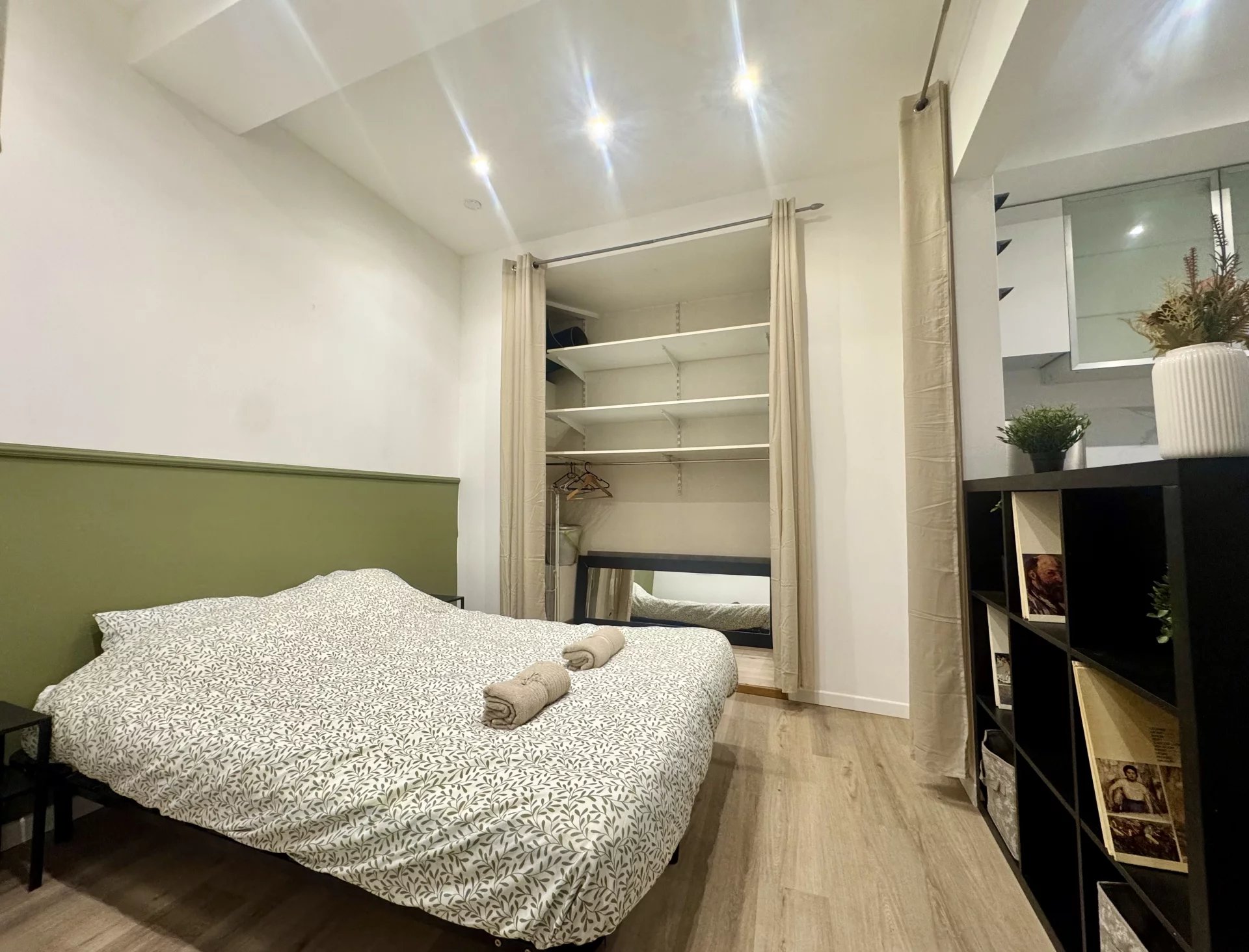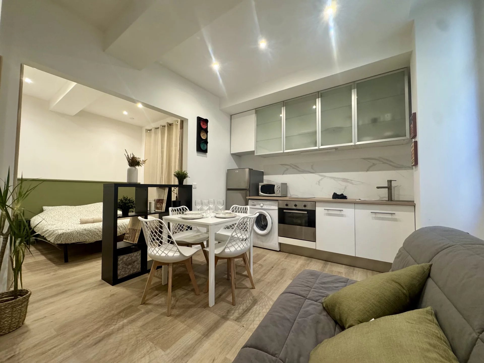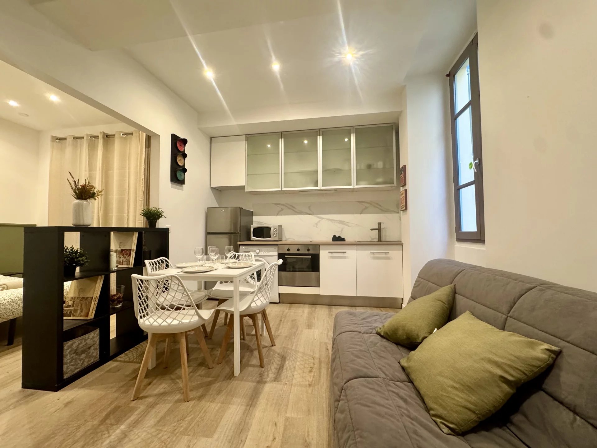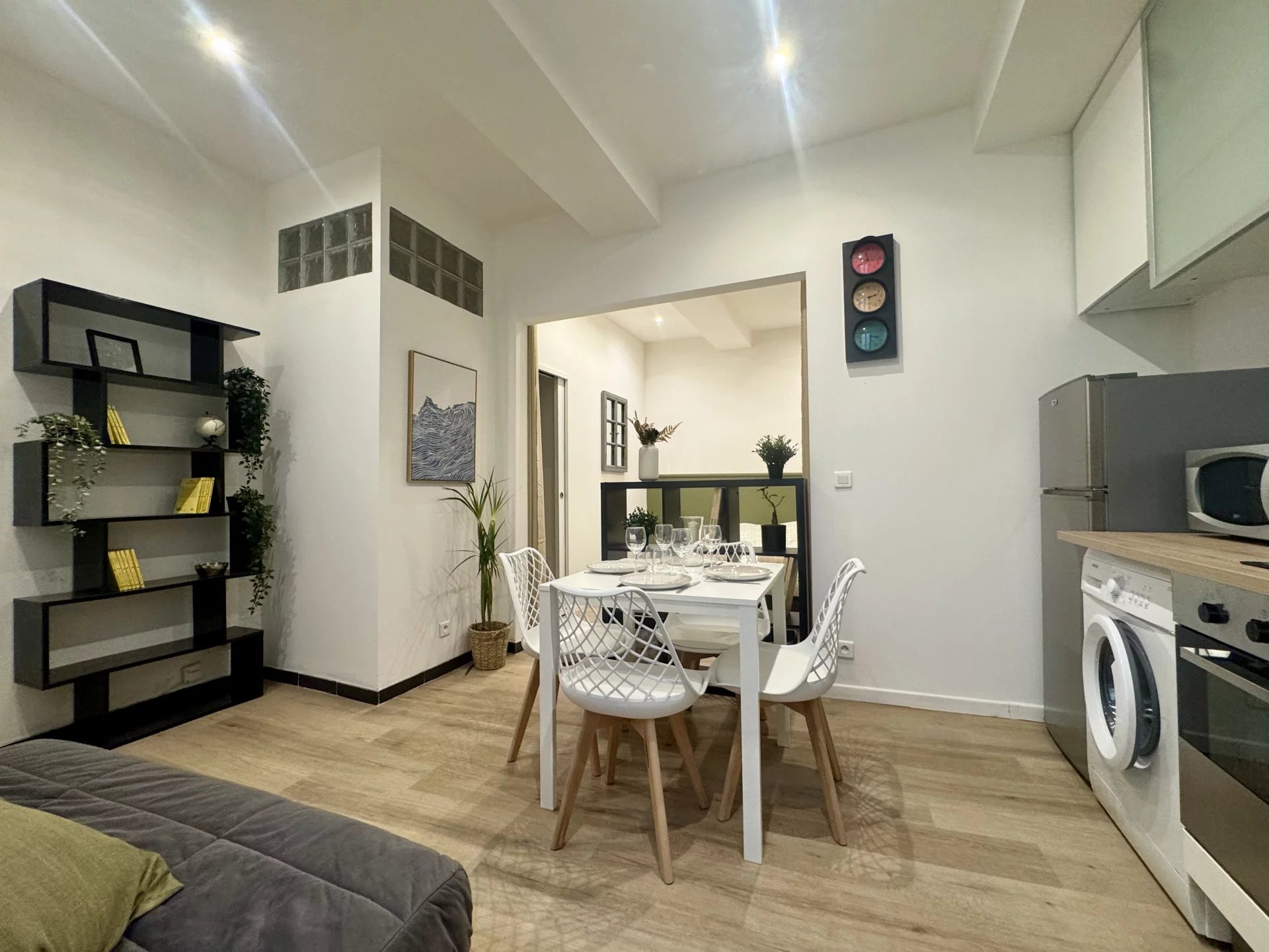 L’appartement se compose d’une pièce de vie lumineuse avec cuisine ouverte, d’un coin nuit séparé et d’une salle d’eau. Les volumes sont optimisés, offrant un espace agréable et bien agencé.