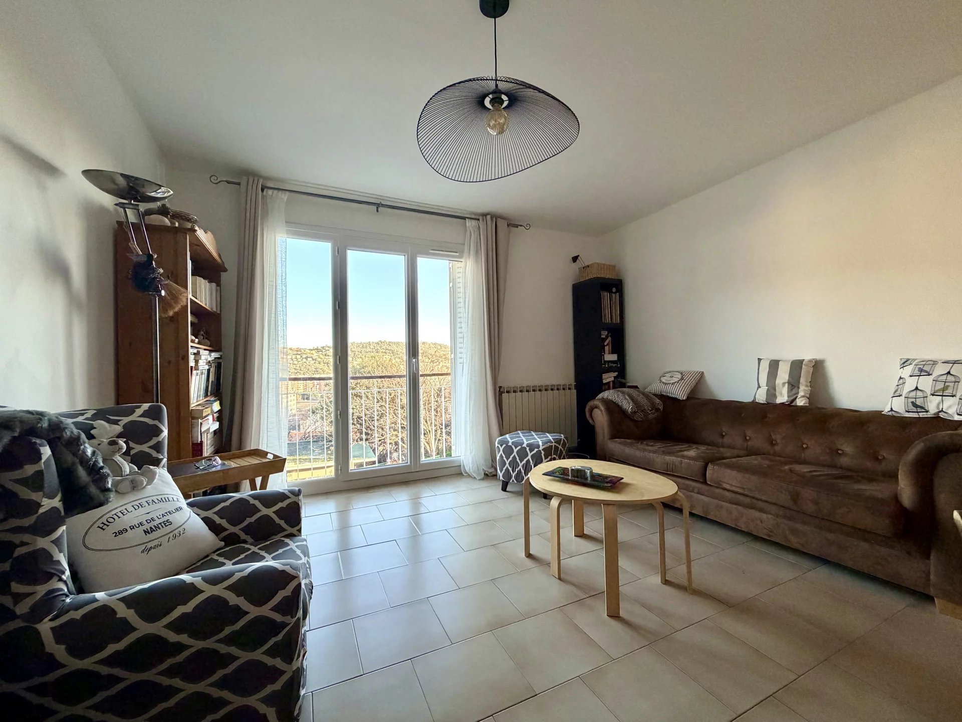 Appartement 3 pièces de 56 m² situé en rez-de-chaussée surélevé, avec une hauteur équivalente à un premier étage côté séjour. Aucun vis-à-vis, vue totalement dégagée et panoramique sur la ville, les collines et un aperçu mer. Appartement traversant Est Ouest offrant une belle luminosité tout au long de la journée.