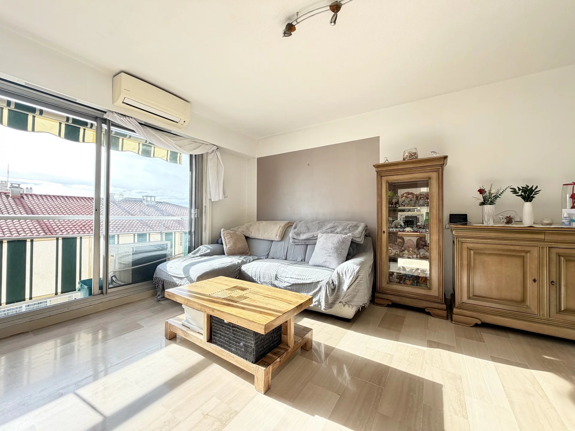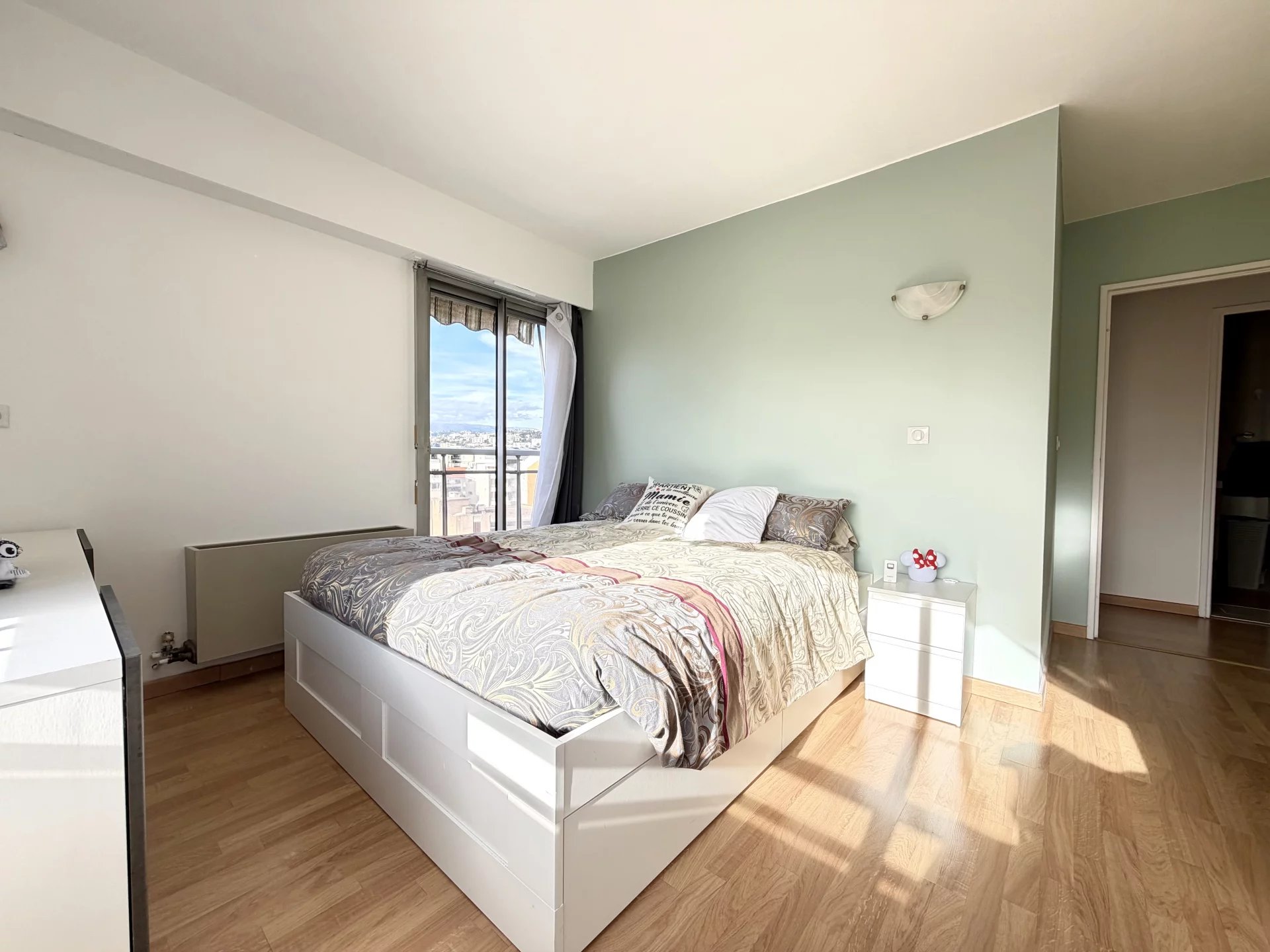 L’appartement est traversant avec une exposition sud ouest, offrant une luminosité remarquable tout au long de la journée. Toutes les pièces disposent de larges baies vitrées, ce qui renforce la sensation d’espace et de clarté. Le séjour climatisé d’environ 20 m² constitue une pièce de vie agréable et confortable.
