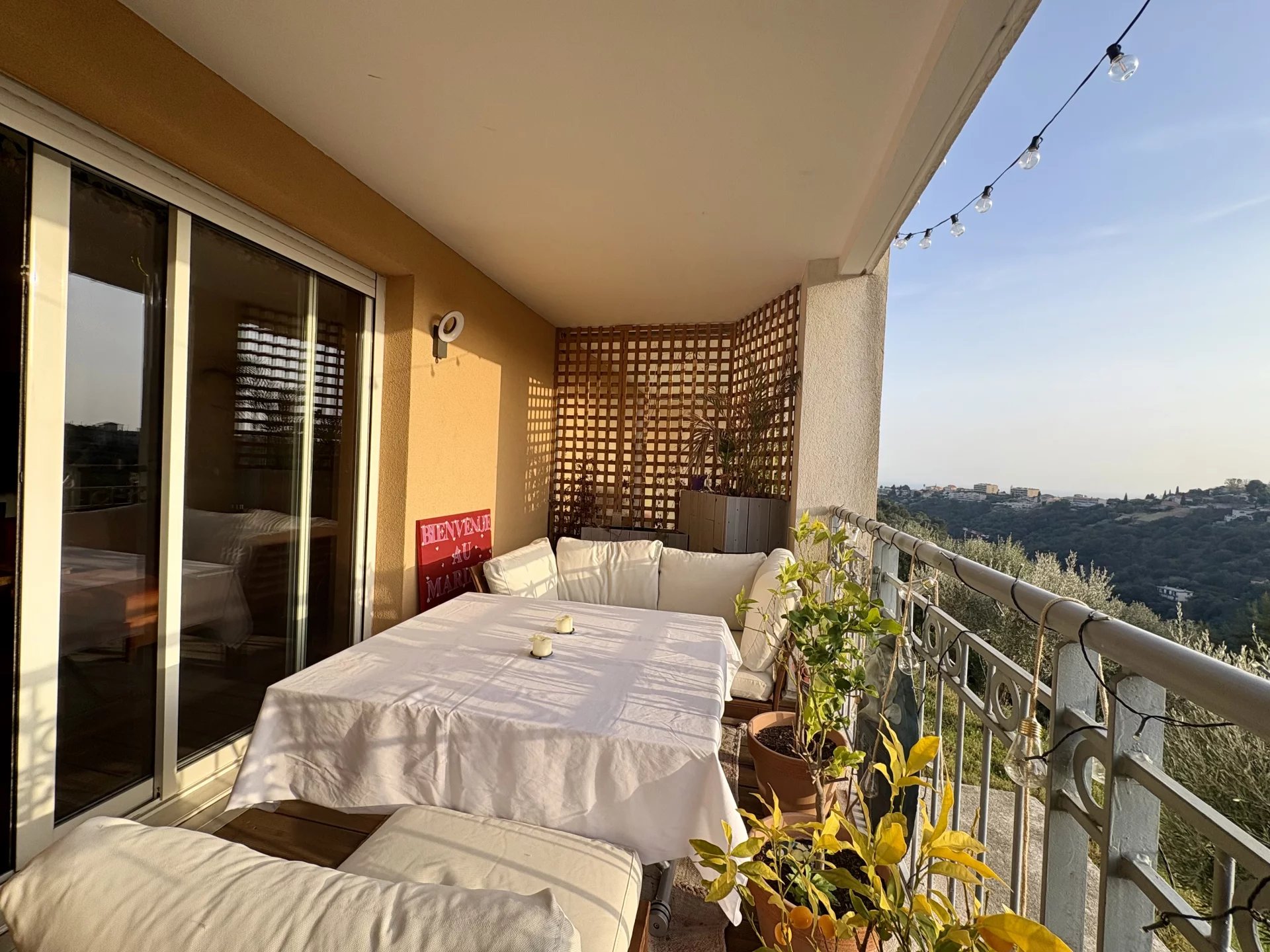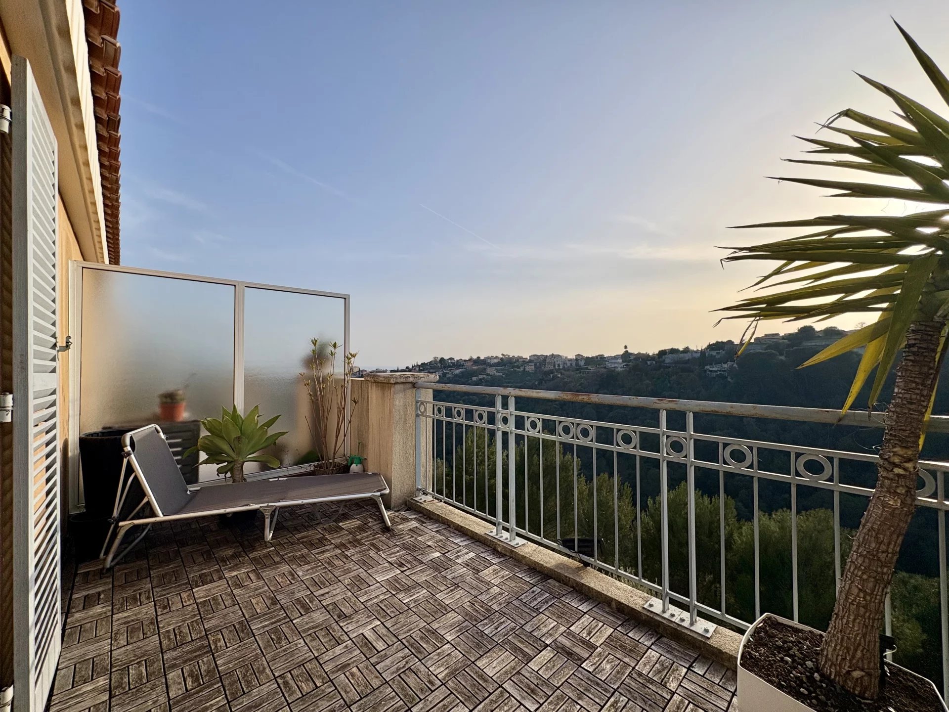 À l’étage, l’espace nuit se compose de deux chambres avec de grands rangements. L’une d’elles bénéficie d’un accès à une belle terrasse d’environ 9 m² offrant une vue dégagée exceptionnelle allant du Baou de Saint-Jeannet jusqu’à la mer. Une salle de bain fonctionnelle complète ce niveau.