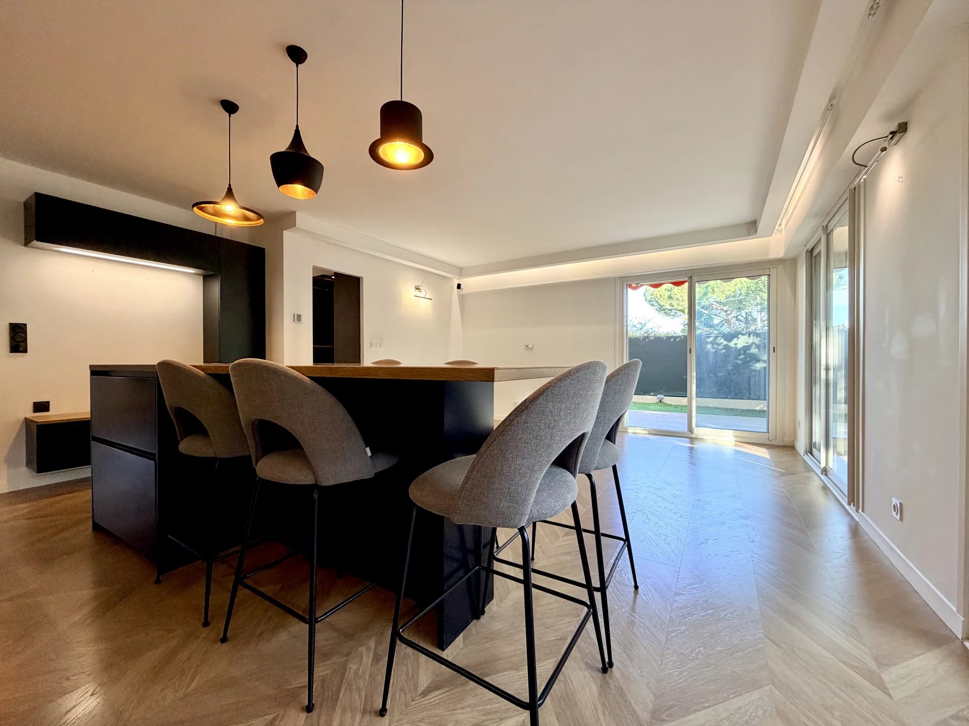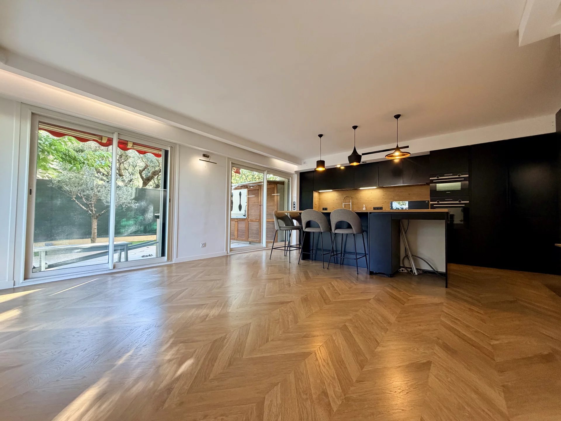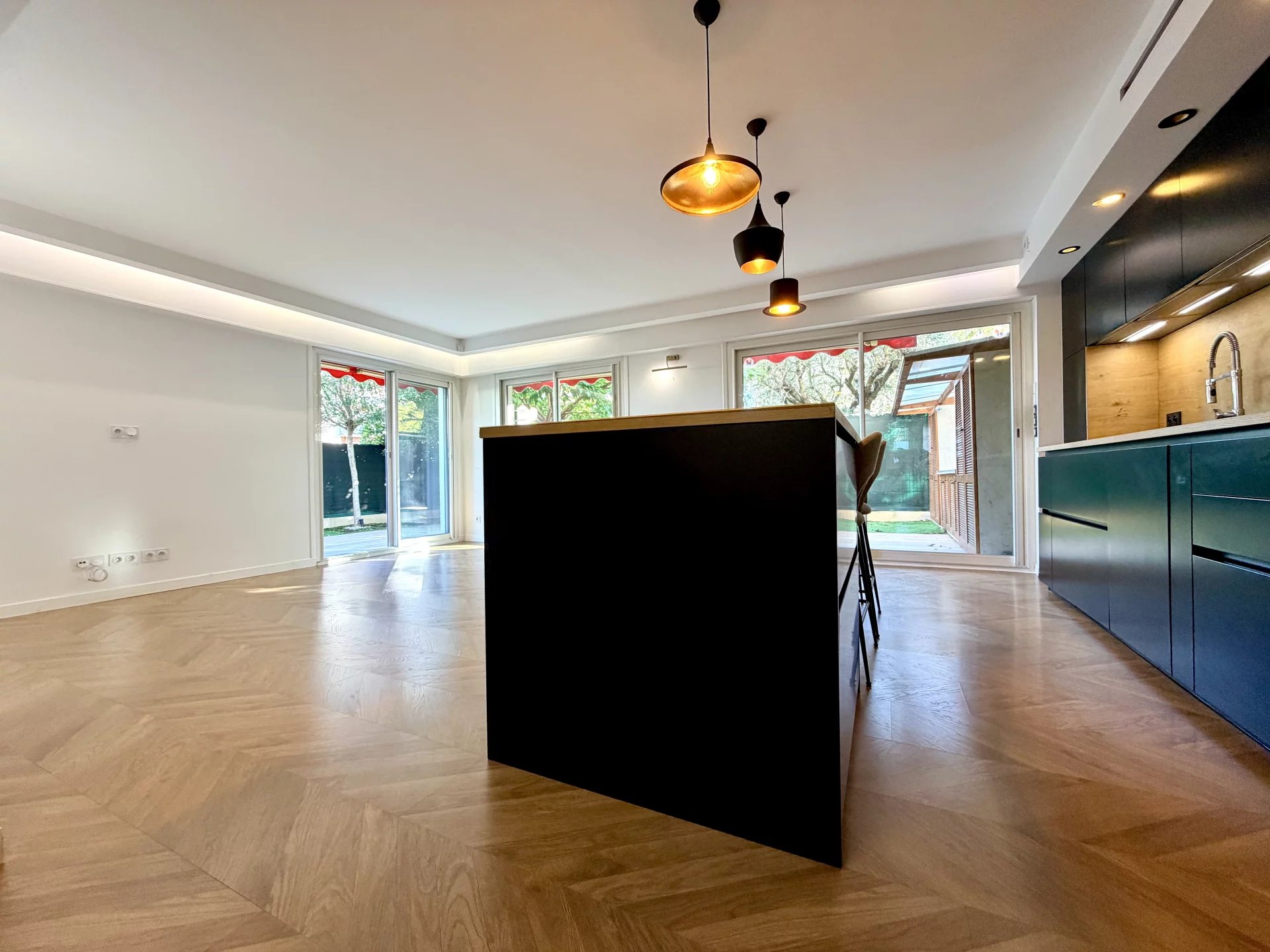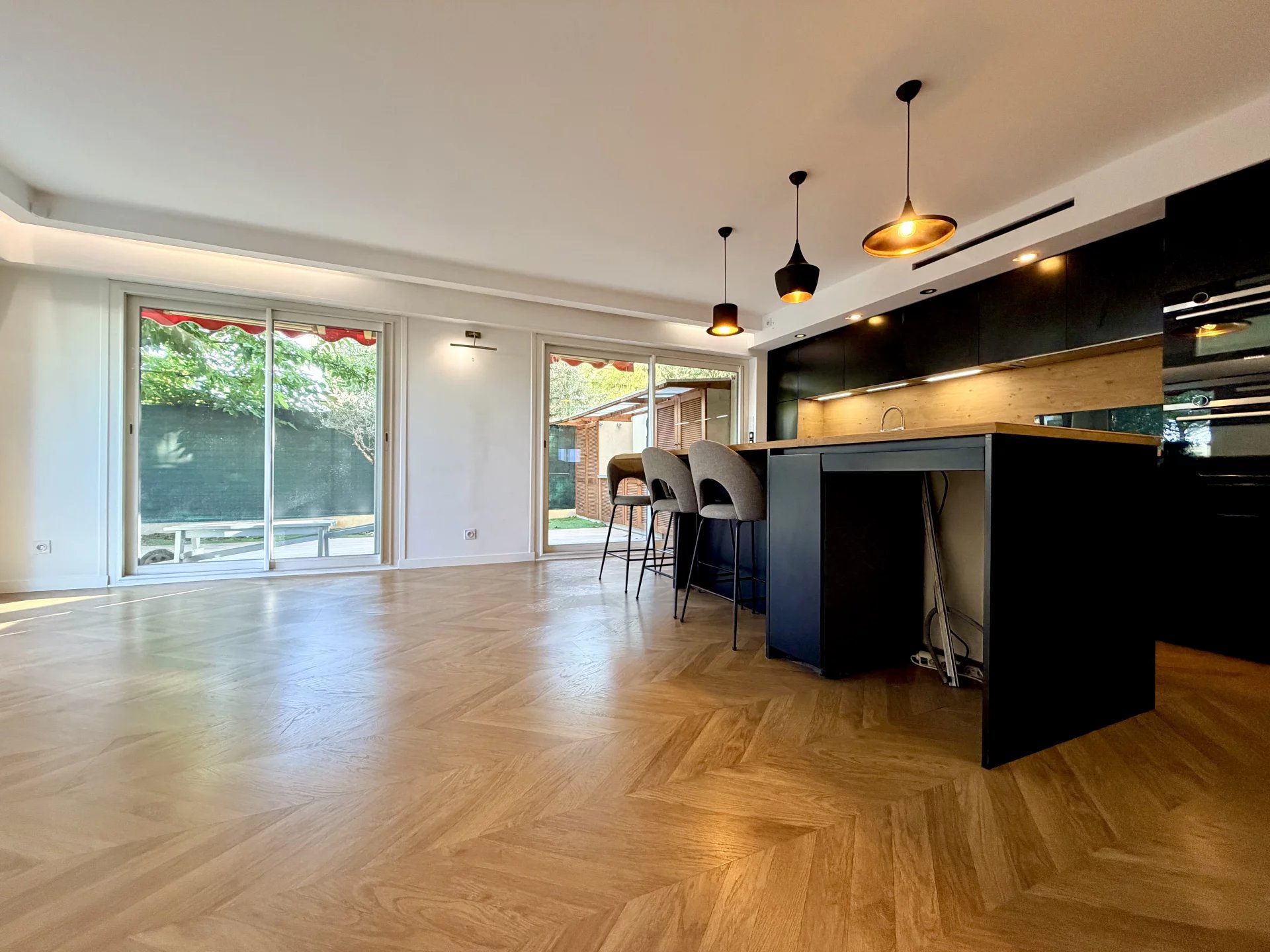 L’espace de vie se compose d’un séjour avec cuisine ouverte, bénéficiant de grandes baies vitrées donnant directement sur un magnifique jardin privatif de 114 m², parfaitement aménagé avec cuisine d’été.