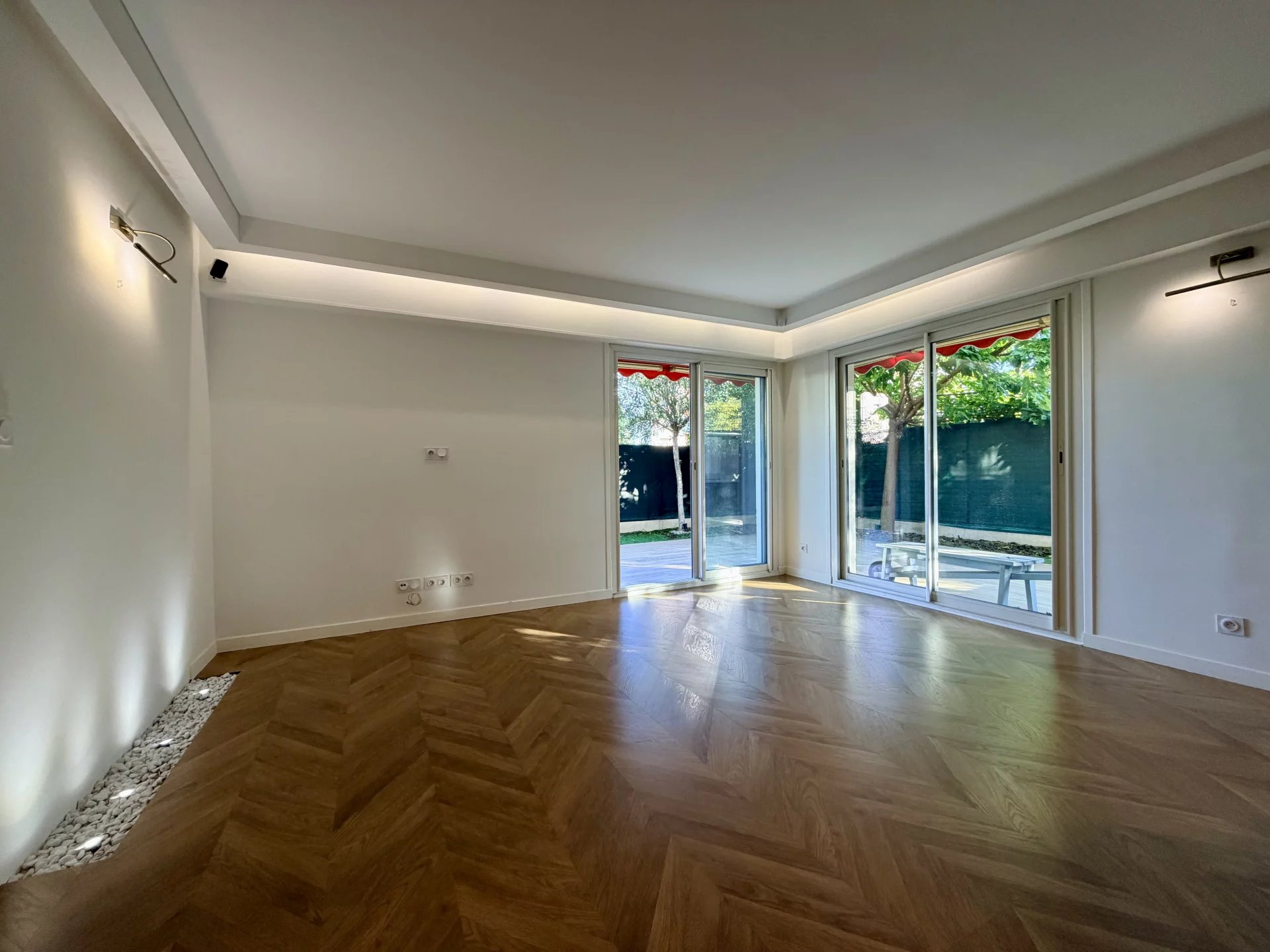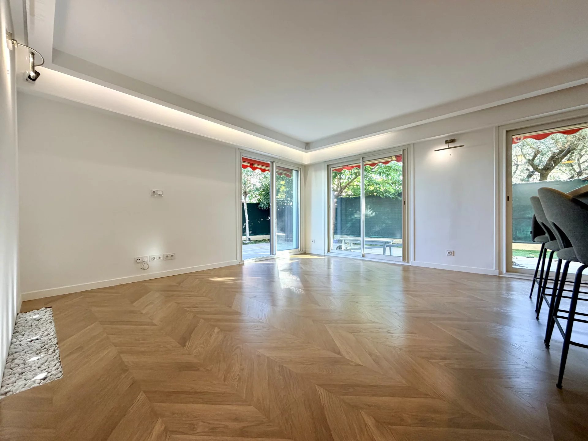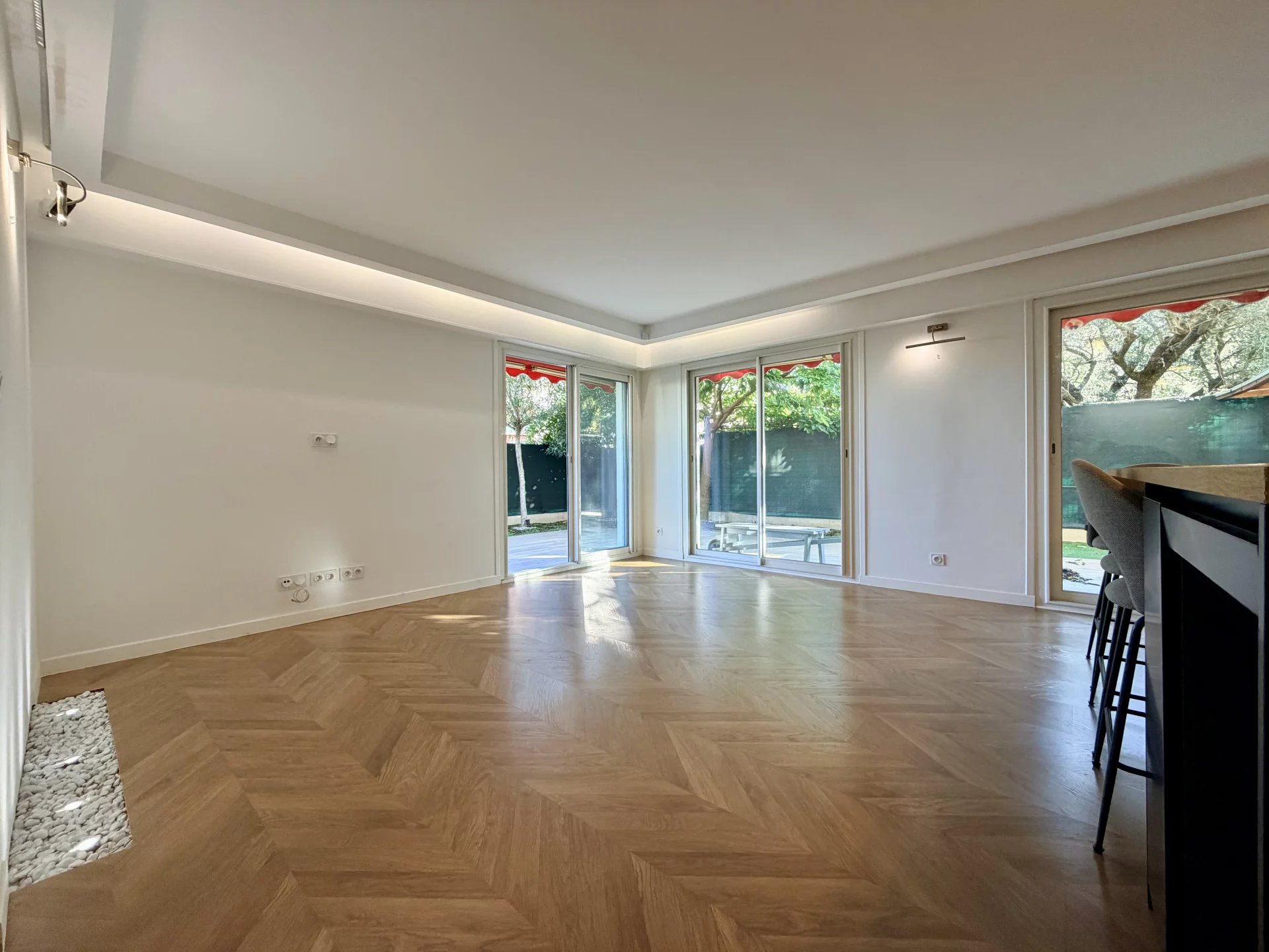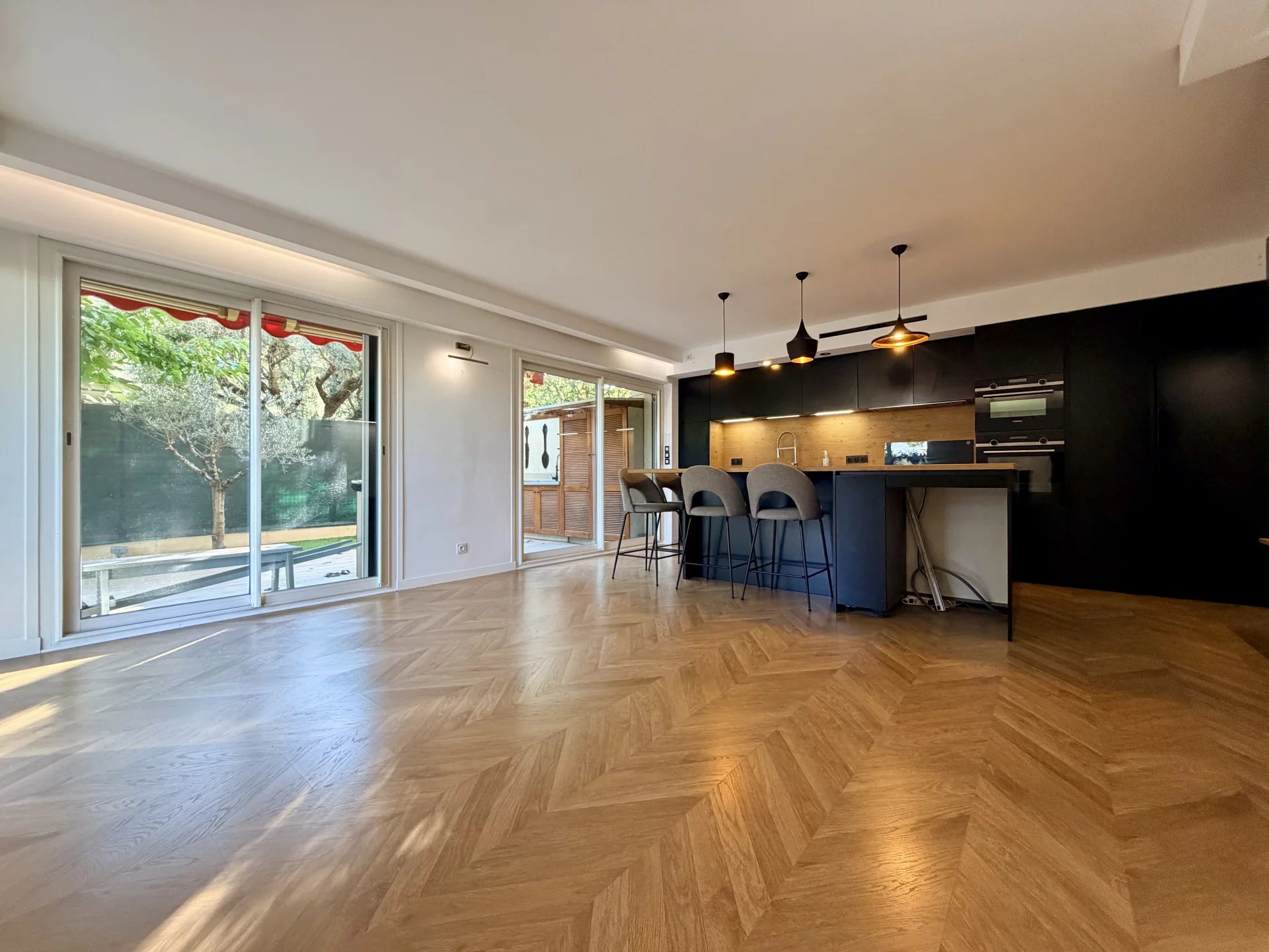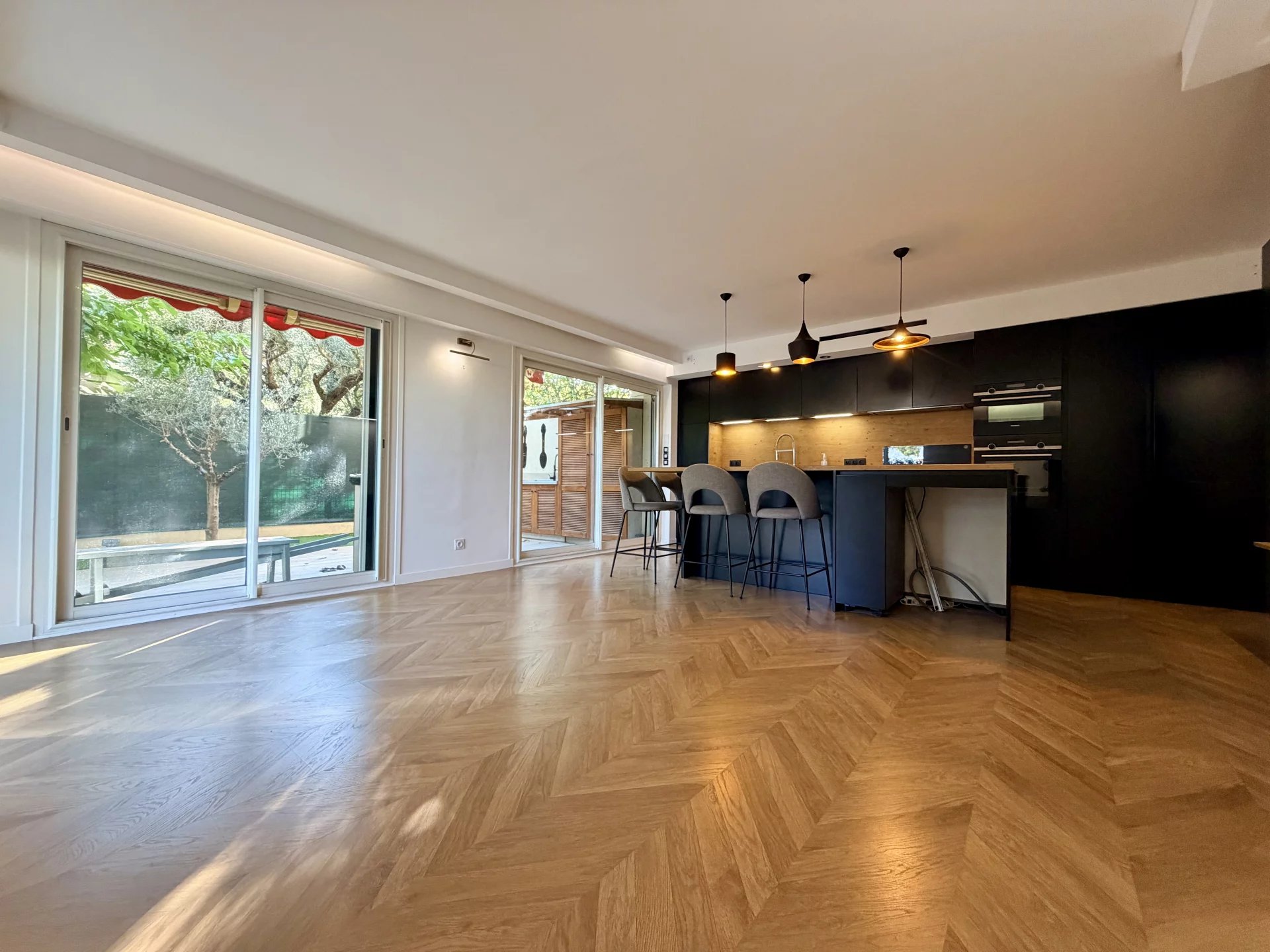 L’espace de vie se compose d’un séjour avec cuisine ouverte, bénéficiant de grandes baies vitrées donnant directement sur un magnifique jardin privatif de 114 m², parfaitement aménagé avec cuisine d’été.