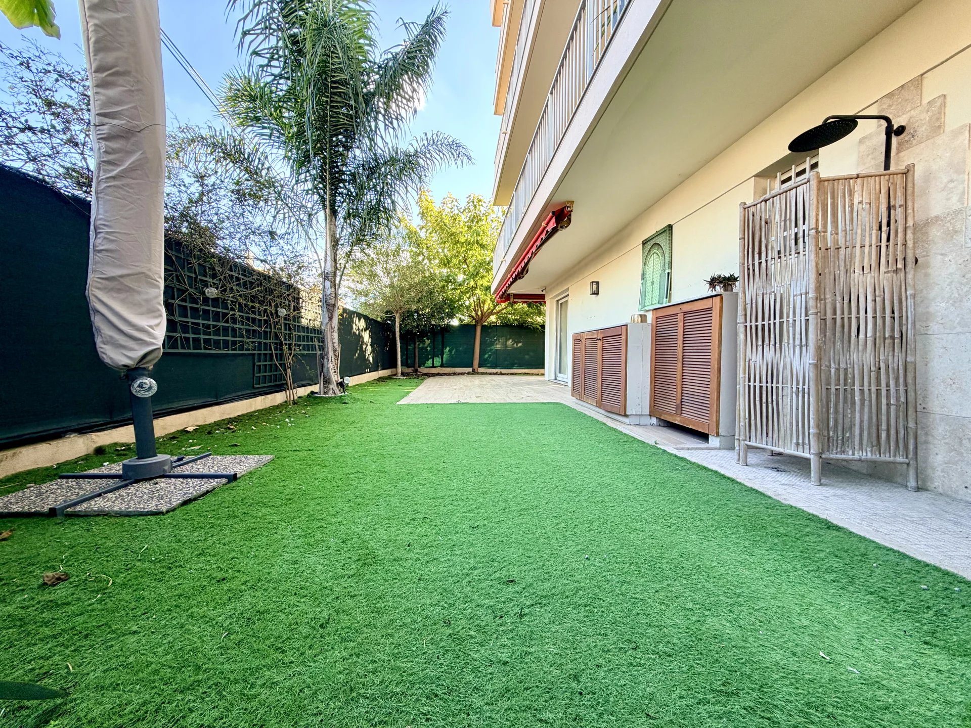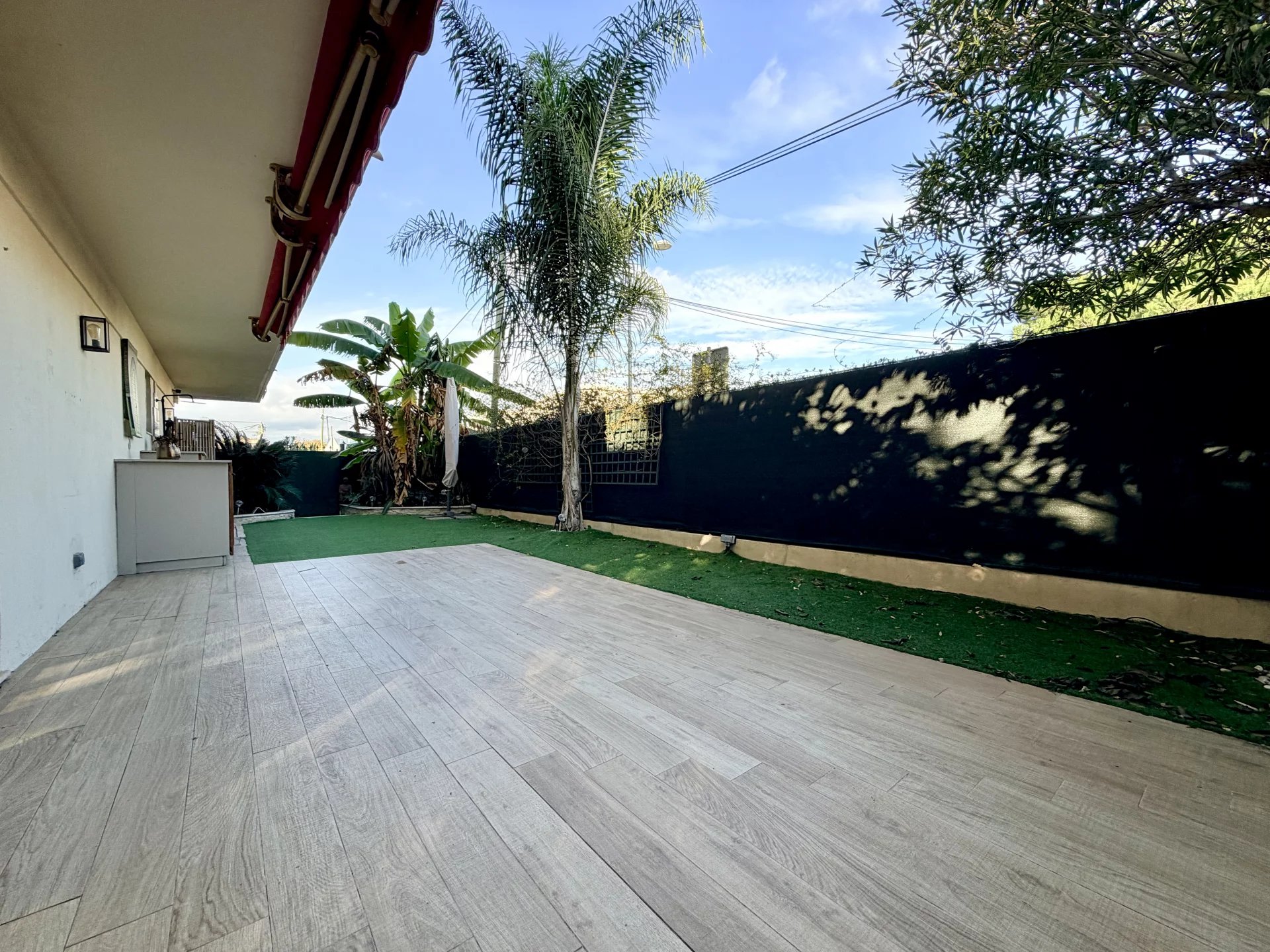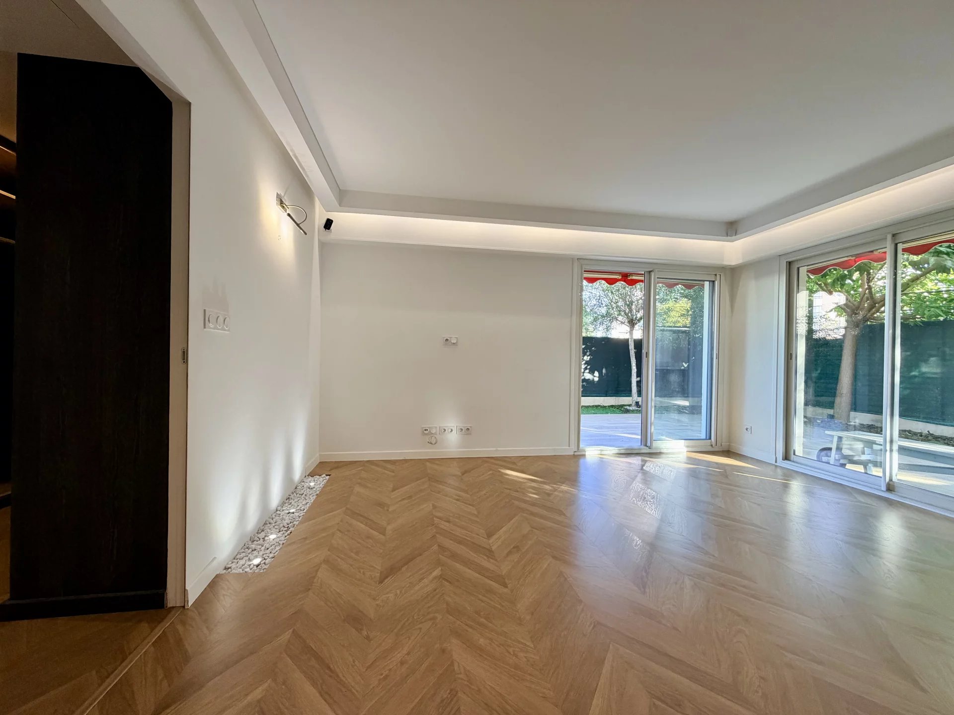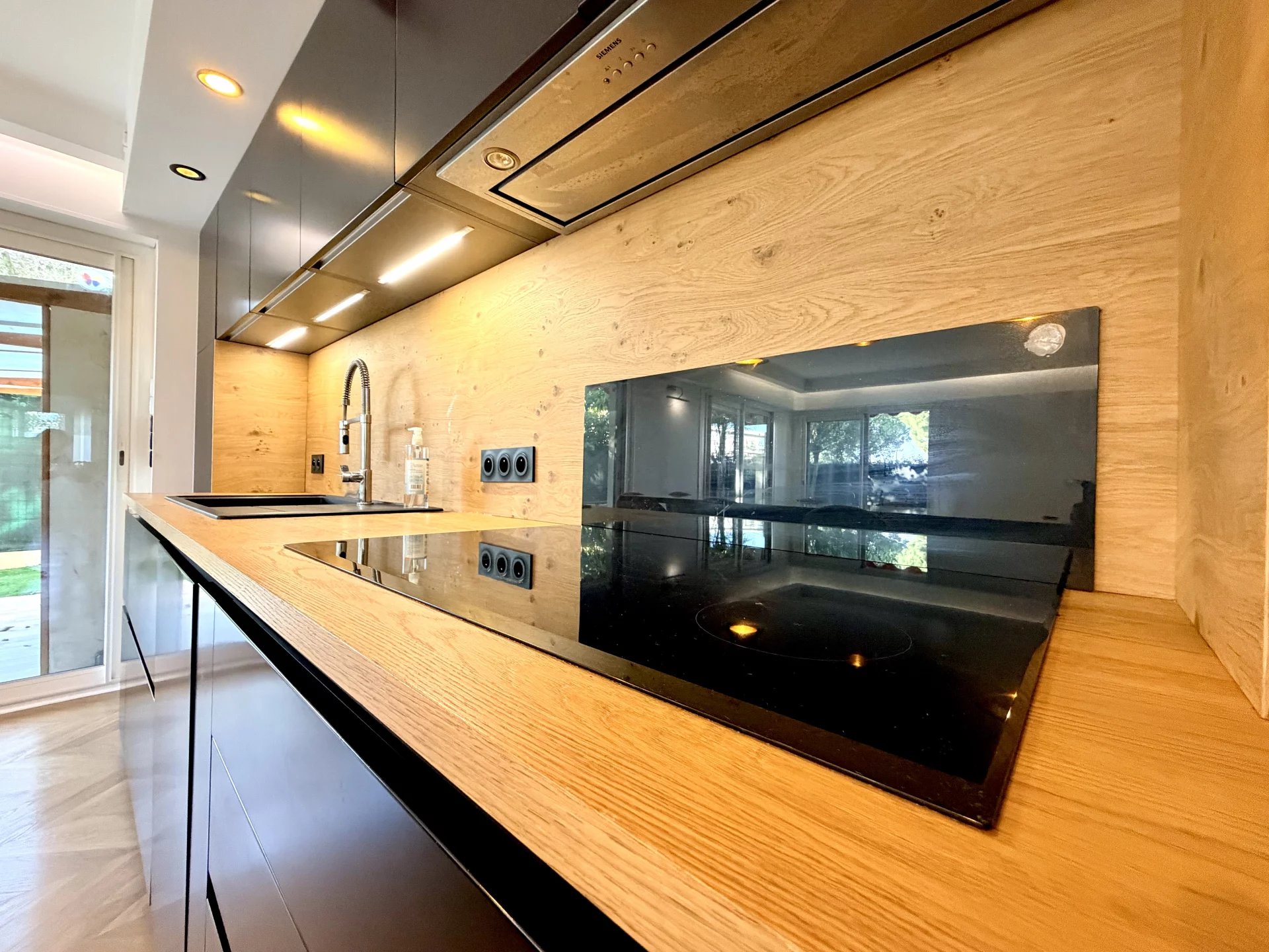L’espace de vie se compose d’un séjour avec cuisine ouverte, bénéficiant de grandes baies vitrées donnant directement sur un magnifique jardin privatif de 114 m², parfaitement aménagé avec cuisine d’été.