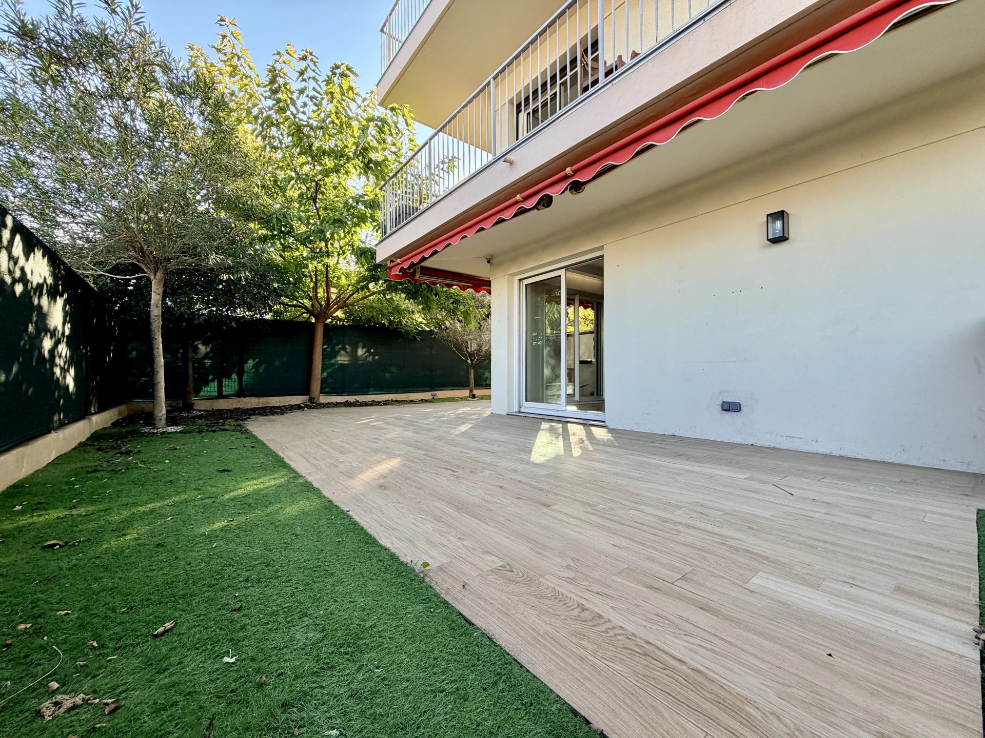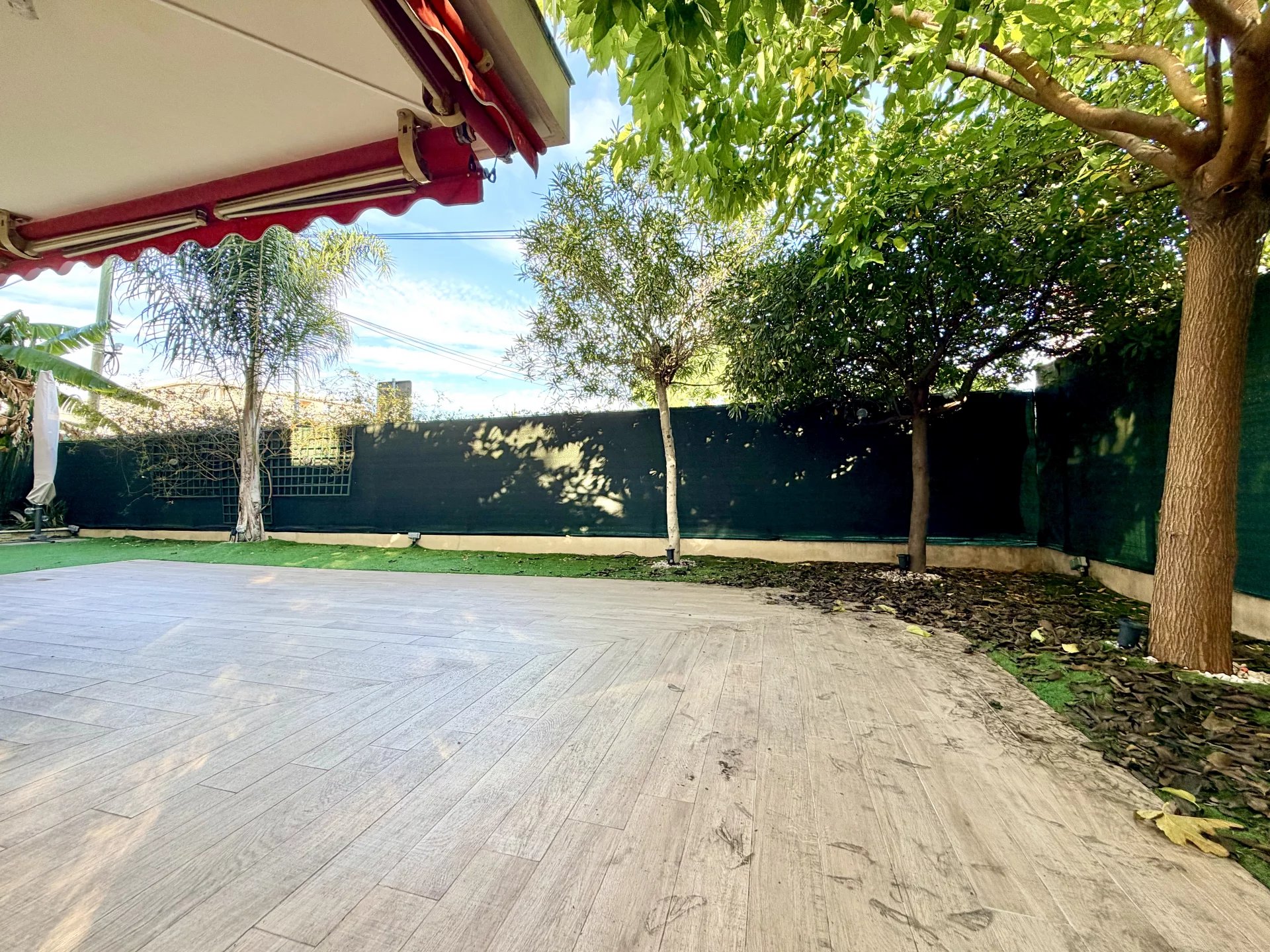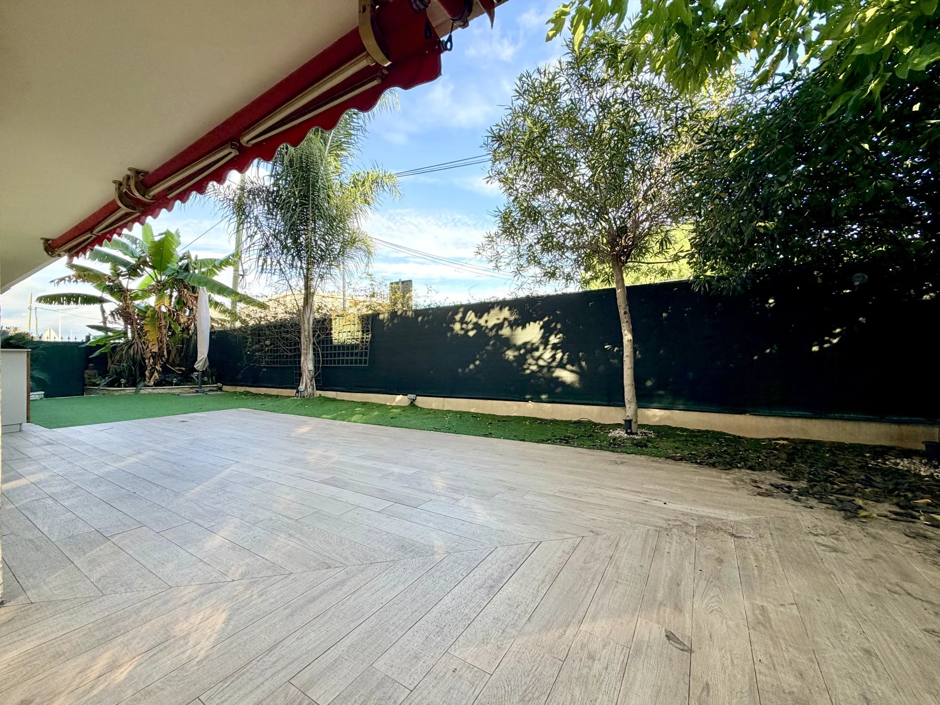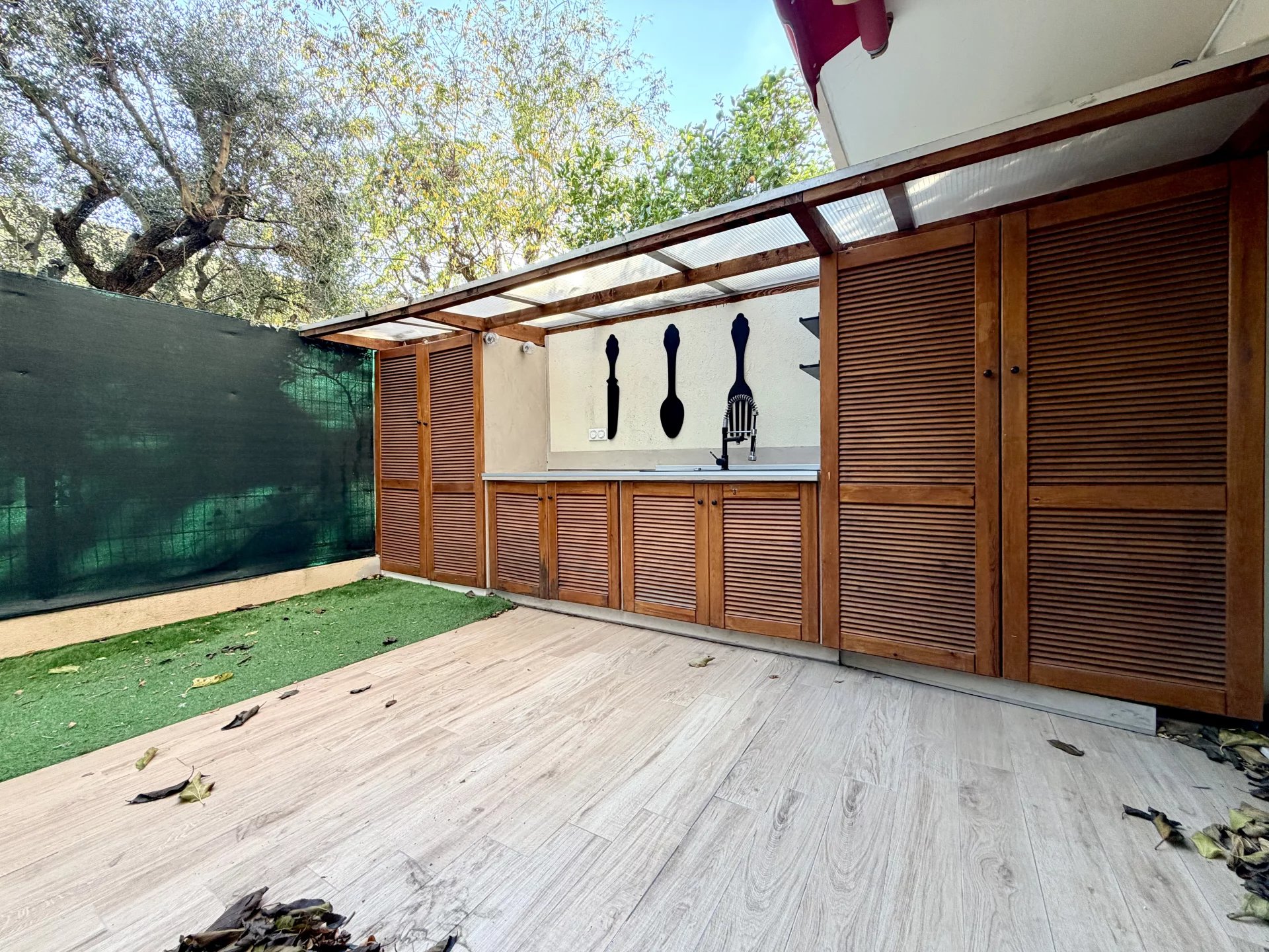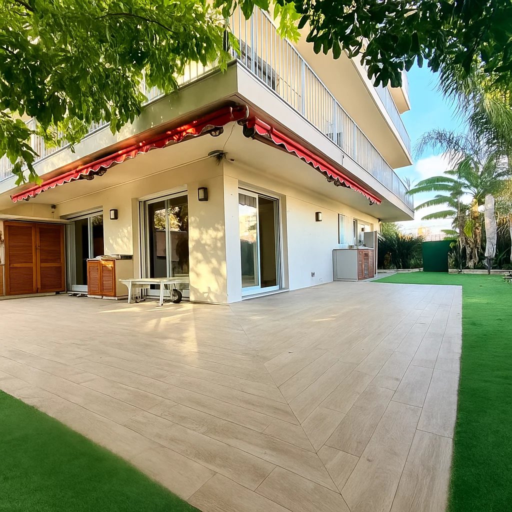 L’espace de vie se compose d’un séjour avec cuisine ouverte, bénéficiant de grandes baies vitrées donnant directement sur un magnifique jardin privatif de 114 m², parfaitement aménagé avec cuisine d’été.
