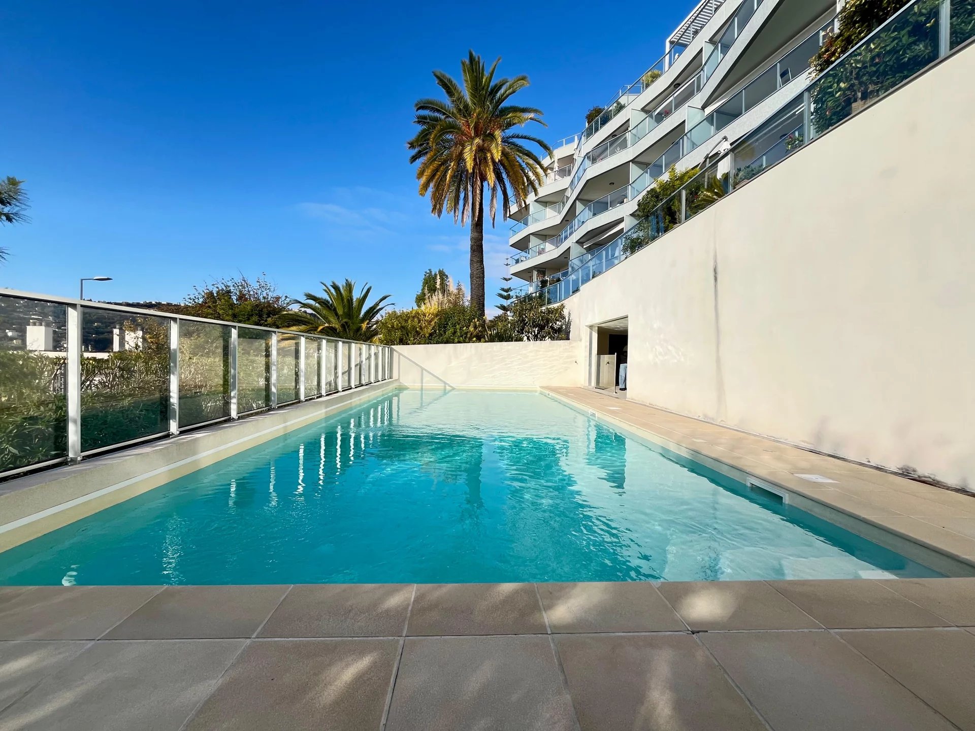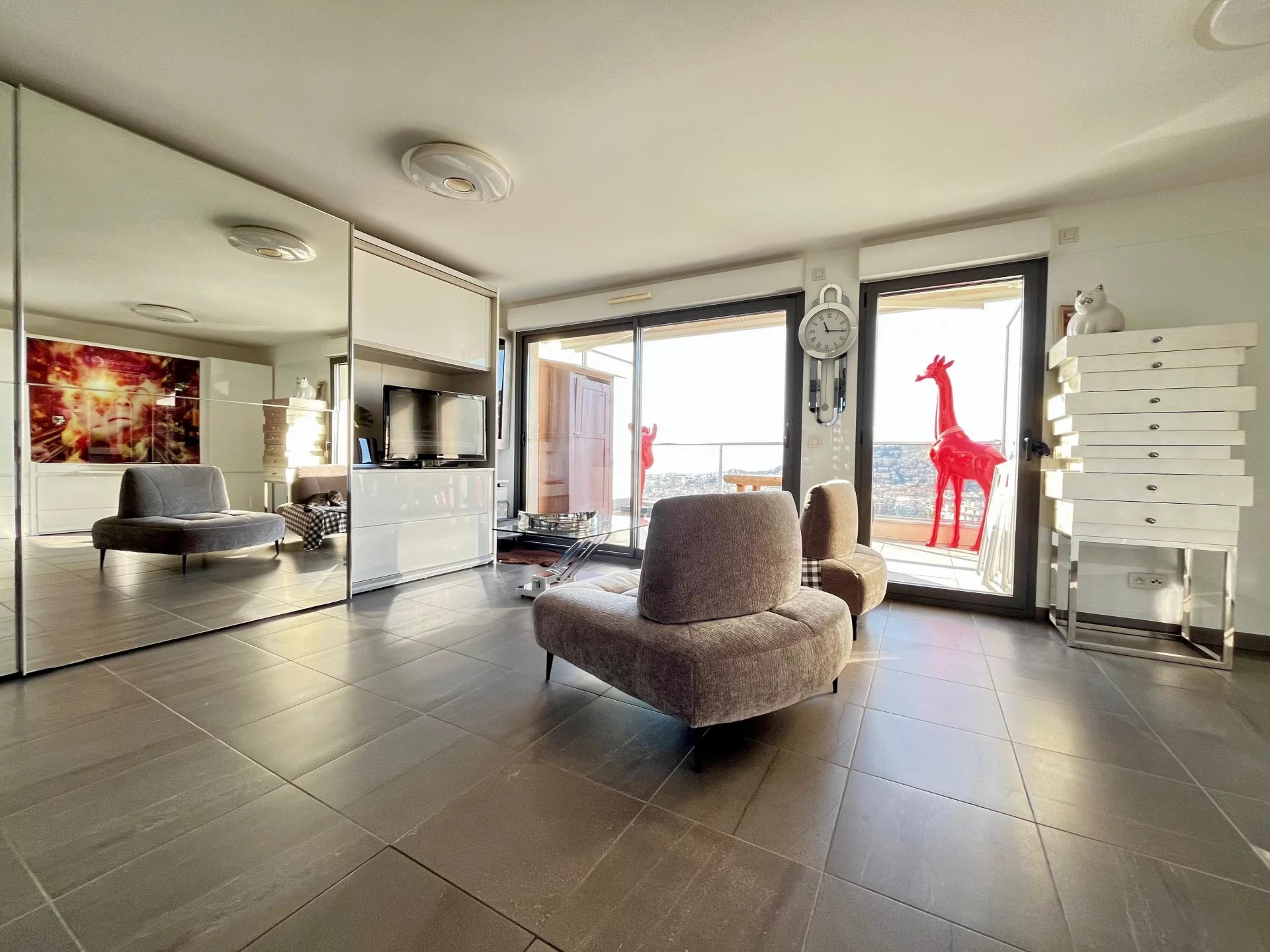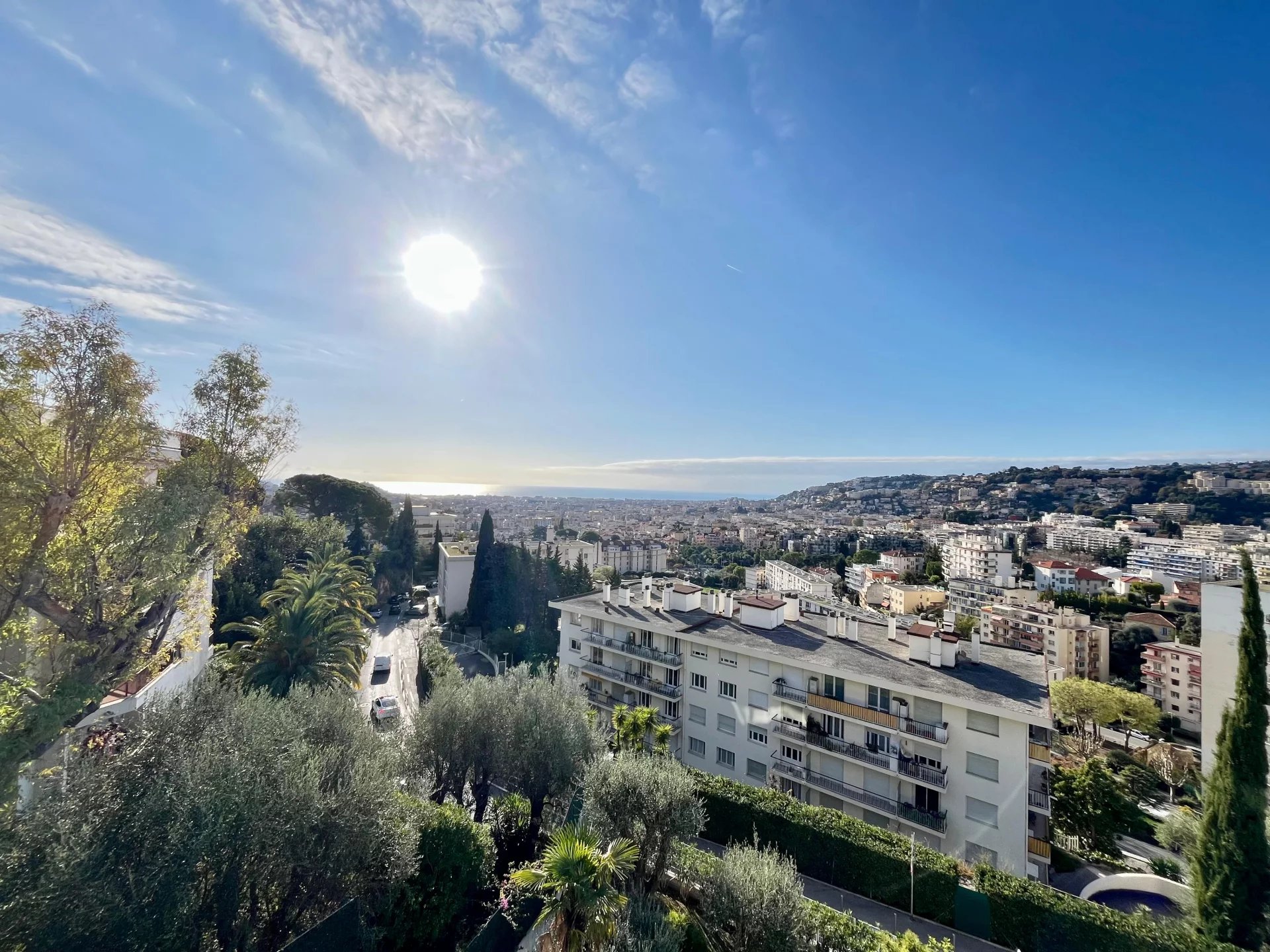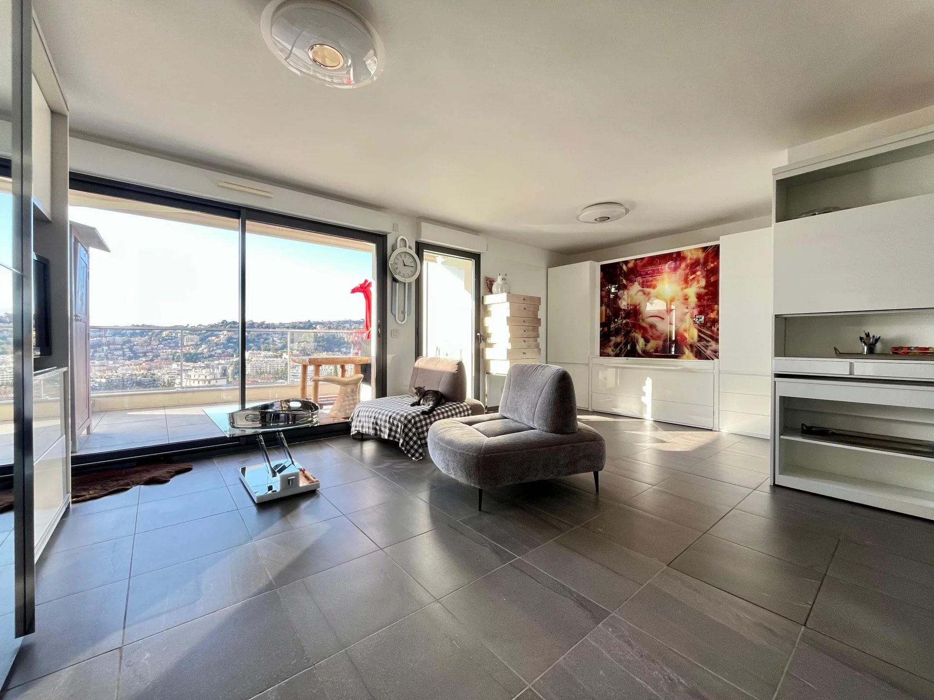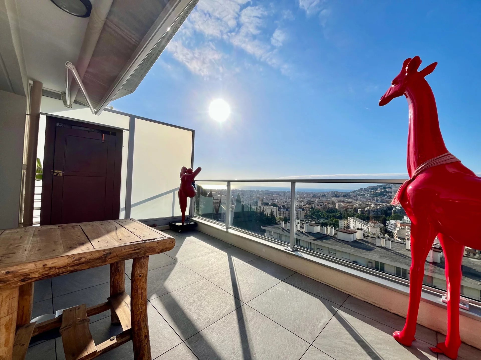 La terrasse de 12 m² offre une vue panoramique spectaculaire sur la ville et la mer, dans un calme absolu.